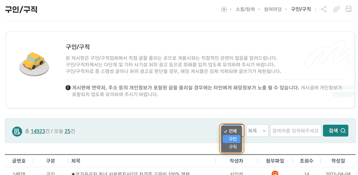 게시판 상단의 분류 선택 항목에서 구인 또는 구직 선택 후 검색하면 목적에 맞는 글을 조회할 수 있습니다.