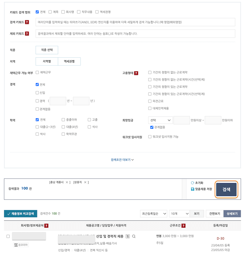 사이트 접속 후 채용정보검색 메뉴를 통해 지역, 직종, 경력, 학력 등 다양한 조건으로 채용 정보를 검색하실 수 있으니 취업을 준비 중인 분들은 한 번 검색해 보시면 좋을 것 같습니다.