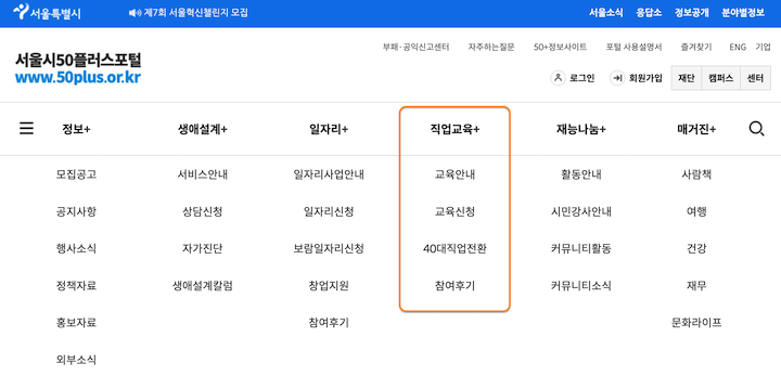 서울시 50 플러스 포털의 직업교육+ 메뉴가 교육 관련된 항목입니다.