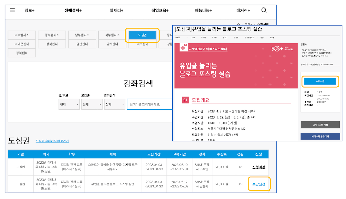 - 교육신청 : 교육센터(오프라인) 강좌 신청