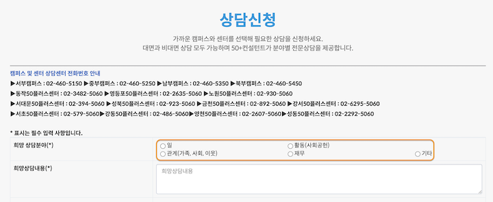 포털의 상담신청 메뉴를 통해 신청하시면 되며, 주제는 일, 활동(사회공헌), 관계(가족, 사회, 이웃), 재무, 기타가 있습니다.