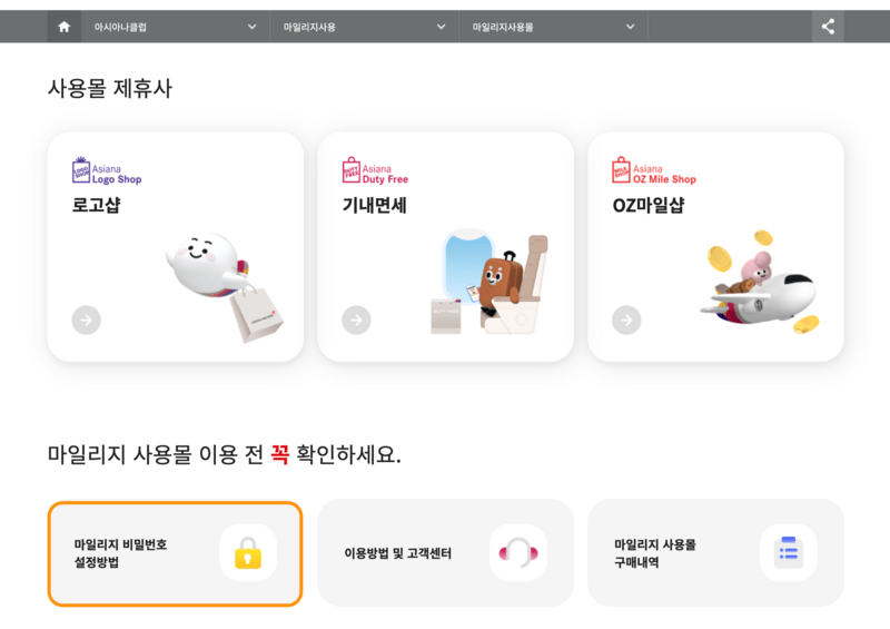 화면에 있는 '마일리지 비밀번호 설정방법' 카드를 클릭해서 비밀번호 설정 후 이용하시면 되겠어요.