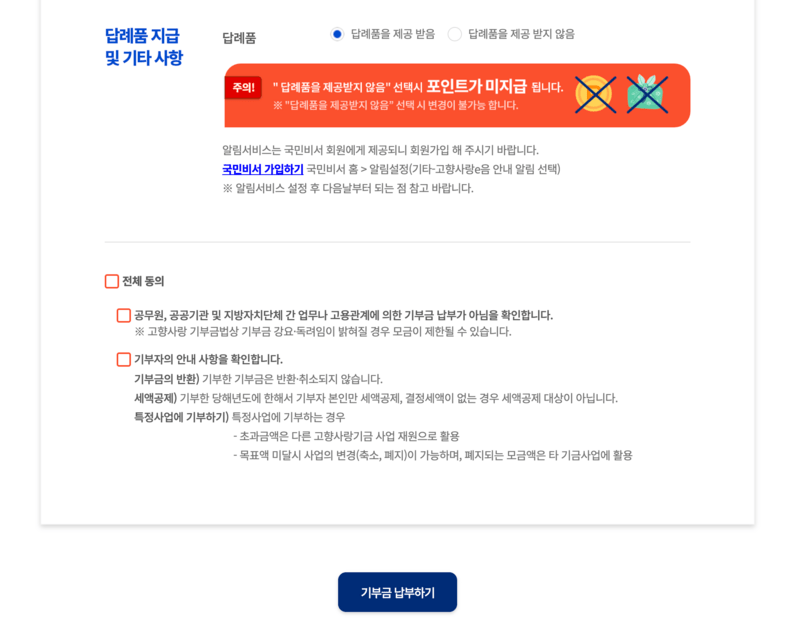 화면을 아래로 내려서 답례품제공여부를 선택하고 동의 완료 후 '기부금납부하기' 버튼을 누르면 됩니다.