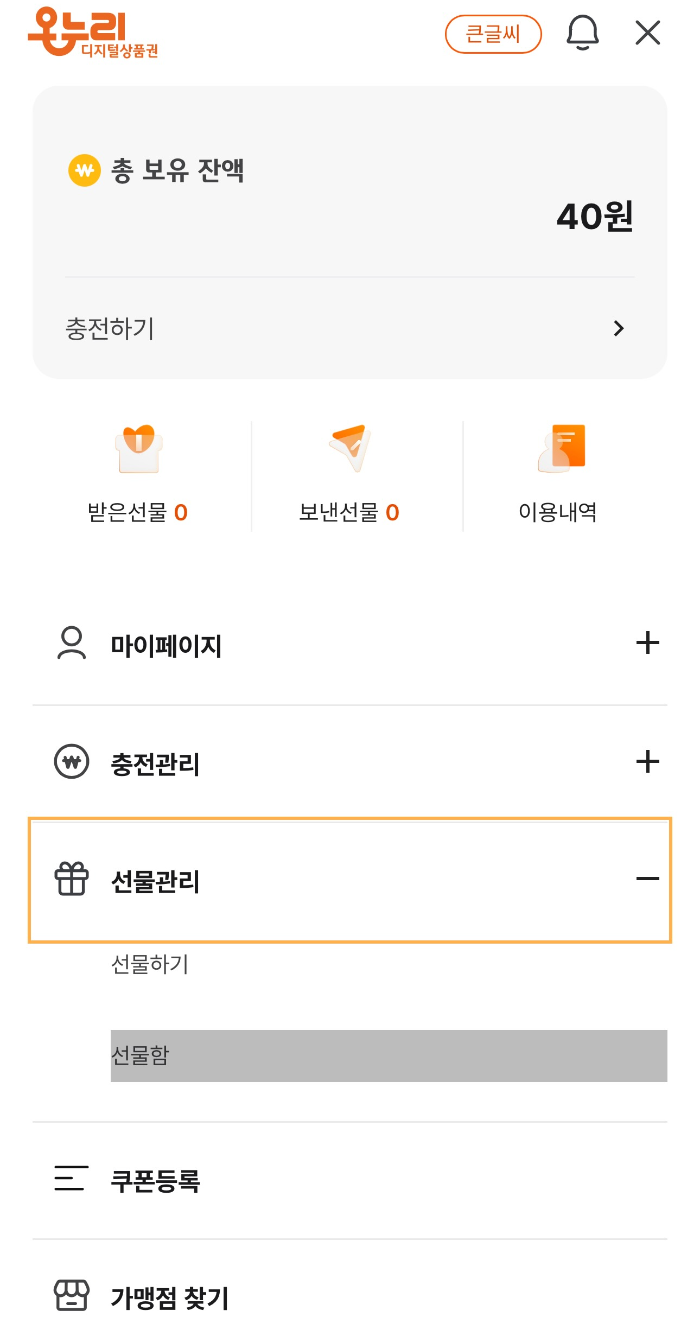 디지털 온누리앱 접속 후 오른쪽 상단의 메뉴를 열고, 선물함으로 이동해주세요.
