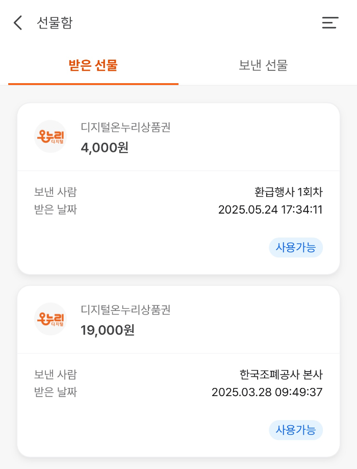 카카오톡 알림을 받은 후 디지털온누리 앱을 실행하여 선물함에서 환급된 상품권을 확인할 수 있습니다.