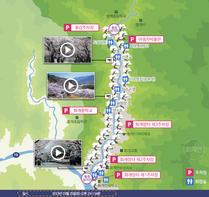 화개장터로 유명한 하동은 봄이 되면 벚꽃을 보러온 손님들로 붐빕니다. 십리(약 4km)에 걸친 도로 양쪽으로 벚꽃이 장관을 이루는데요, 하동군에서도 실시간 CCTV를 통해 벚꽃 개화 상황을 전하고 있습니다.