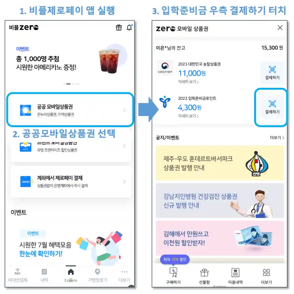 책을 구매하시고 결제할 때는 '비플제로페이' 앱 실행 후 '공공 모바일상품권' 선택, 입학준비금 우측 '결제하기' 버튼 누르시면 됩니다.