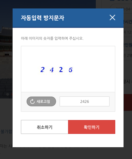 예매하기 버튼 클릭하면 아래와 같이 자동입력 방지 숫자 입력 창이 나오니 당황하지 말고 입력해 주시면 됩니다.