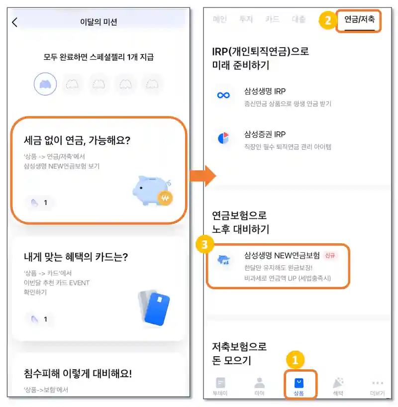 1. 미션 화면에서 '세금 없이 연금, 가능해요?' 카드 터치하면 '상품' 화면으로 이동합니다.