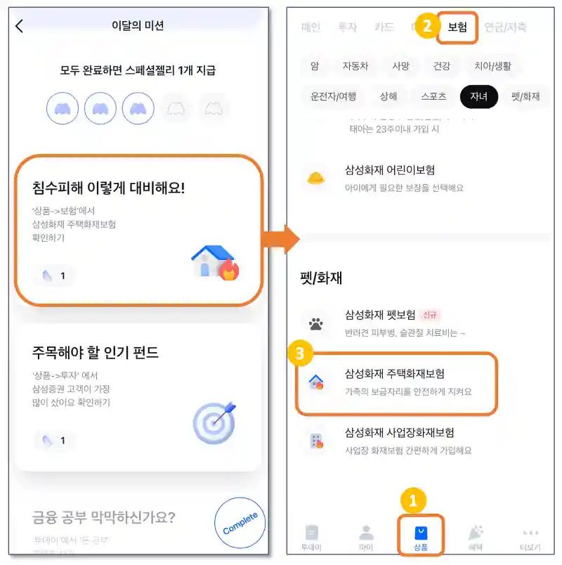 3. 화면을 내리거나, '펫/화재' 버튼 터치 후 '삼성화재 주택화재 보험'을 터치하면 미션 완료!