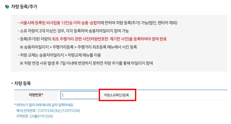 - 승용차 정보 입력 (12인승 이하 개인 승용/승합차 보유 시) 및 운행거리 단축